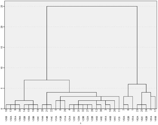 Figure 2. Hierarchical cluster analysis using Ward’s linkage (where V = variable, and “31B” indicates the position in the new classification: Table 1, Table 2, Table 3, Table 4, Table 5 and Table 6).