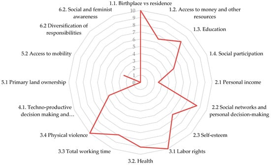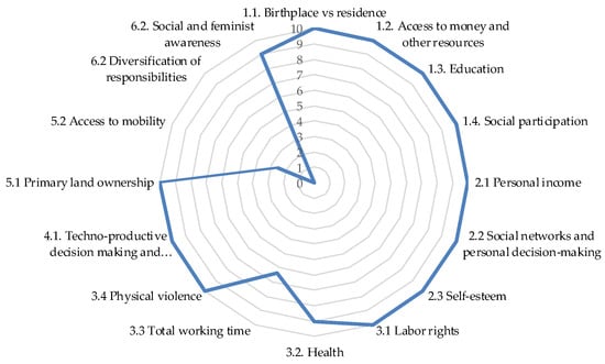 Institutionalized patriarchy reduces women’s capacity to act both in the private environment of the patriarchal family and in the public sphere, directly affecting their degree of autonomy [56]. Consequently, a lesser decision-making capacity in relation to farm productive issues (4.1.c) and/or household matters (2.2.a) is common among women. In strong male chauvinistic contexts, women frequently have to ask for permission to be able to carry out numerous personal or family decisions (2.2.b) [69,71]. Another basic element that helps understand the degree of women’s personal autonomy and empowerment is the analysis of women’s social network. Belonging to social networks (family and friends) is a component that strengthens women’s fallback position, providing them with personal-emotional and economic support. Improving women’s fallback position increases their capacity to act and their access to the resources required for subsistence and autonomy outside the home (1.1.a) [56]. The possibility to stay in their place of origin or uxorilocal residence (with the woman’s parents or close to them) is another social network factor that can reinforce women’s capacity to act (4.1.e).