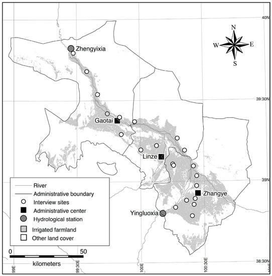 Map of the study area—the middle reaches of Heihe River Basin that begin from Yingluoxia and end at Zhengyixia (gray circles), covering three districts: Zhangye, Linze, and Gaotai. White circles represent the 21 selected interview sites that spread across the irrigated farmland.