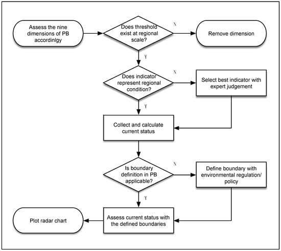 Decision-making flow chart of downscaling the environmental dimensions, indicators, and boundaries from Planetary Boundaries to Regional Safe Operating Space.