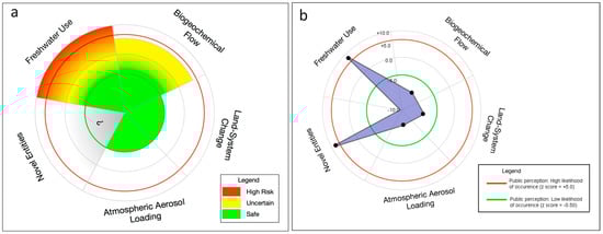 Residents of the Heihe River Basin responded to a questionnaire in which they were asked to rank the possibility whereby each environmental component assessed through the downscaling of the planetary boundary would exceed the RSOS. Normalized responses (z-scores) corresponding to the social perception of the likelihood of RSOS transgression are summarized in Figure 3b. Significant z-scores were classified as perceptions that corresponded to a high likelihood of occurrence (z-score > +1.645) or a low likelihood of occurrence (z-score > −1.645). Overall, perception trends (Figure 3b) corresponded to clear trends in the RSOS (Figure 3a). Notably, freshwater use was both perceived and estimated to be likely to exceed RSOS boundaries, while atmospheric aerosol loading and land-system changes were similarly perceived and measured to be within safe environmental operating zones.
