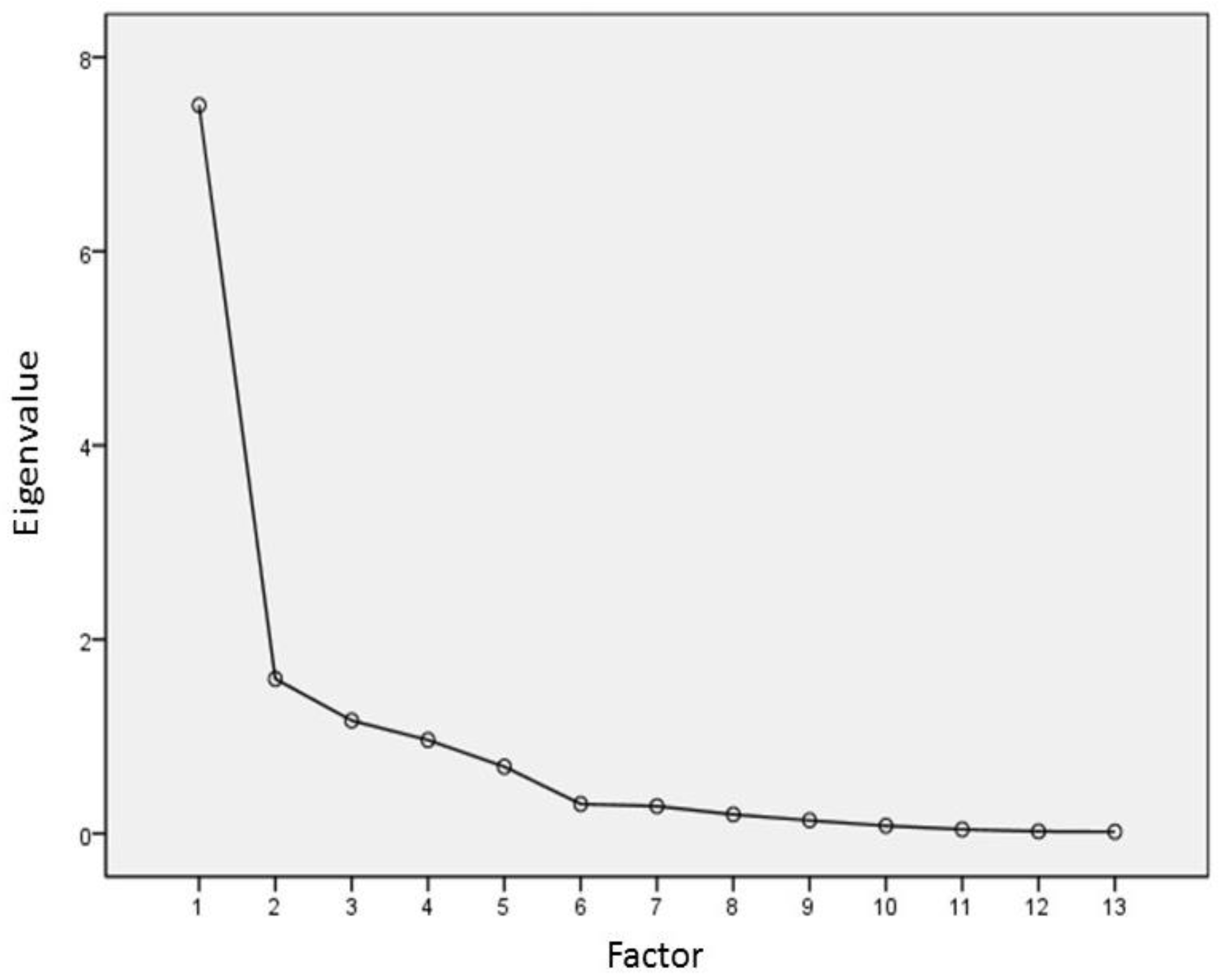 First of all, based on the objective weight-value method, a principal component analysis is employed. After six rotations of the matrix, the selected 25 indicators are boiled down to 13 independent factors with the loading weight by eigenvalue shown in Figure 2. From the scree plot, it can be seen that the first three factors are the most important contributors to the CQ. Factors four and five are also significant.