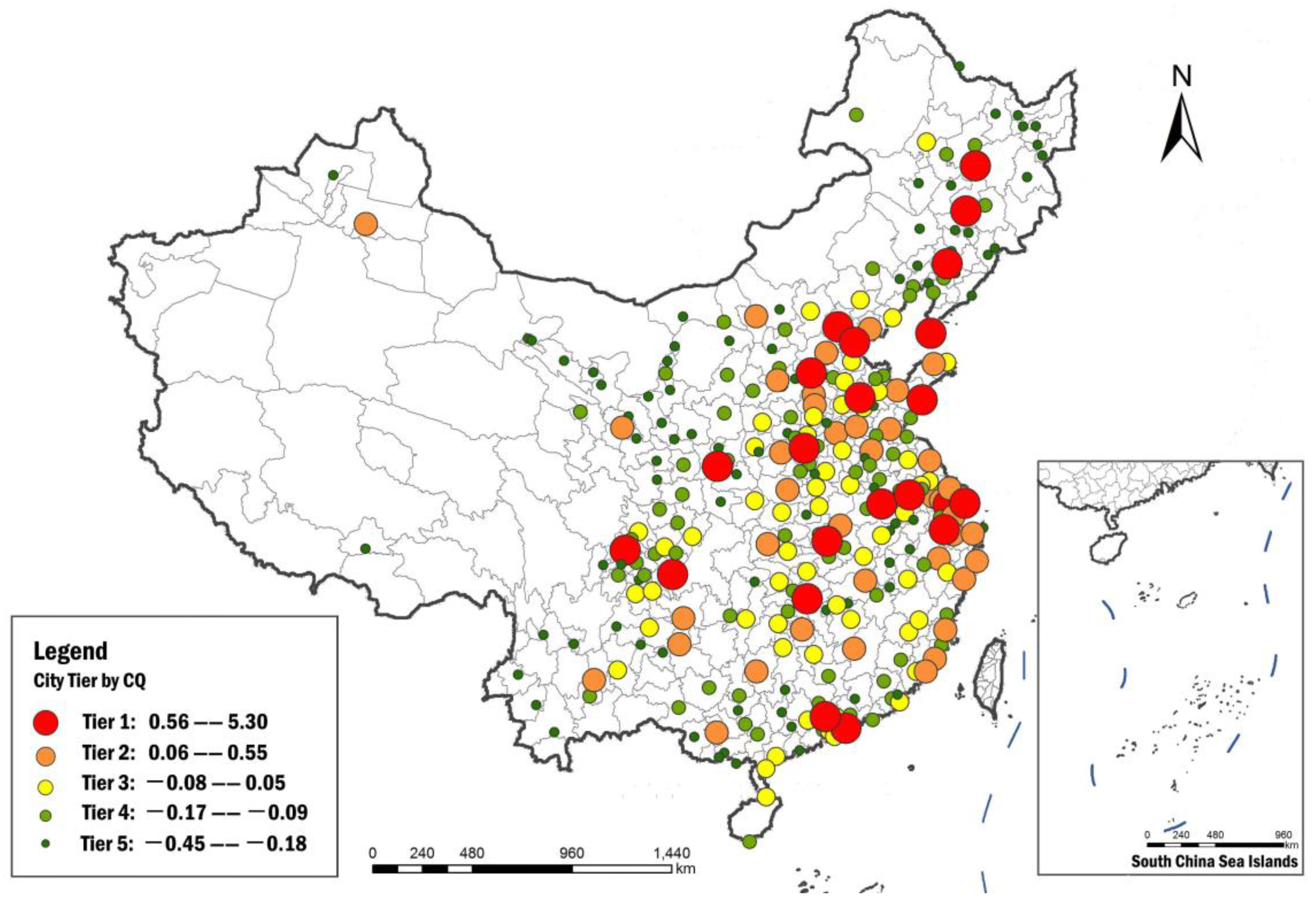 Spatial distribution pattern of Chinese prefectural-level cities by Culture Quotient (CQ) tiers.