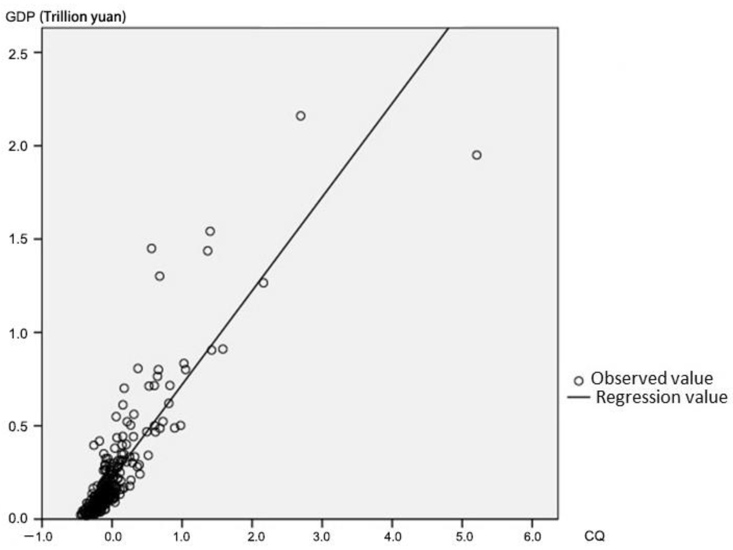 It can be seen from the Formula (2) that the regression coefficient is very high with R2 = 0.76, meaning that it can be used to measure the intensity between CQ and GDP. In other words, based on the empirical test in China’s prefectural-level cities, this indicates that every increase of one percentage point in CQ of one city will induce five percentage points increment in GDP of that city.