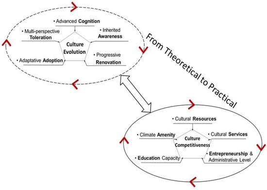 Figure 5 that cultural resources could be regarded as the foundation for advanced cognition, while cultural services could be taken as an approach for reinforcing people’s inherited awareness. Entrepreneurship with a high level of administration can serve as the engine for innovation and renovation, particularly in China, where the government administration is so powerful in terms of development. The high education capacity can lead people to be more adaptative in a positive way. Climate amenity can usually provide comfortable natural settings for attracting diversified population [
