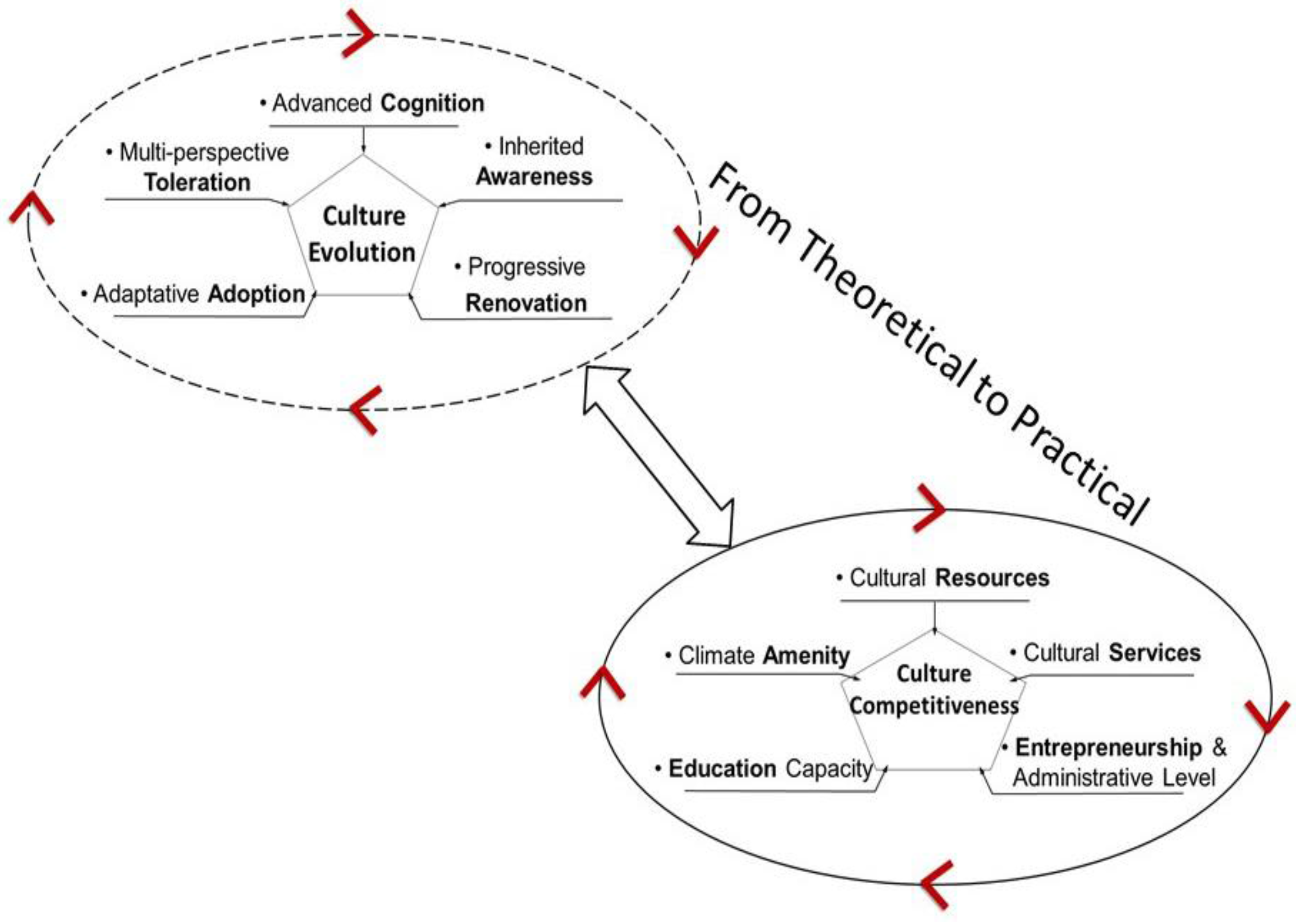 Figure 1, while the empirical study in China’s case proves that this pattern can be reflected by and applied to reality. In fact, the five factors identified in the CQ index system could constitute a culture competitiveness model. By comparing the theoretical culture evolution pattern and the practical culture competitiveness model, as shown in