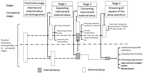 As previously mentioned, SMED is a tool developed by Shingo [7] to reduce bottlenecks caused by stamping press machines that were not working at full capacity. To solve this problem, Shingo divided SMED implementation into four stages, which are depicted in Figure 2. Each stage includes internal and external activities. Internal activities must be completed when the machine is stopped, whereas external activities have to be completed while the equipment is running.