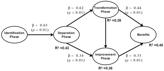 The model was executed using WarpPLS 5.0® algorithm with a resampling bootstrap in order to improve values of indices and diminish the effect of possible outliers [62]. In addition, hypotheses were validated by analyzing direct, indirect, and total effects between latent variables. As for direct effects, we estimated values of the beta parameter as a dependency measure, while p-values were used to determine statistical significance of hypotheses. Since statistical tests were run with 95% of confidence level, p-values had to be lower than 0.05. On the other hand, indirect effects between latent variables occurred through a third our fourth latent variable, also known as mediator. Indirect effects are depicted in the model by more than two paths. Finally, to obtain total effects between latent variables, we added their direct and indirect effects.