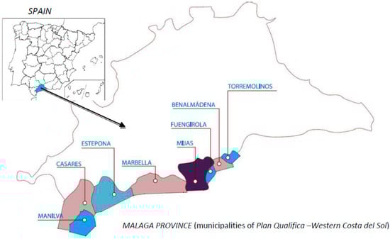 This analysis has been conducted on the Western Costa del Sol (Andalusia, Spain) (Figure 1), which stands out as a typical mature and obsolete sun-and-sand tourism destination with recognized problems of unsustainability [80,81,82] in need of renewal of its tourism development patterns. It is a destination that has carried out an expensive repositioning strategy in the market through investment in sustainable tourism development (Plan Qualifica).