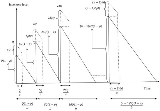 - Vendor transports delivery lots in a dissimilar size. Each shipment lots increases at a rate δ. The main rationale of such assumption is to reduce the holding cost of vendor. As higher holding cost has a huge impact on the total cost. Therefore, to control the holding cost, the vendor sends delivery lots to buyer in an increasing manner. In this case, it is assumed that every delivery lots enhances at a rate δ.