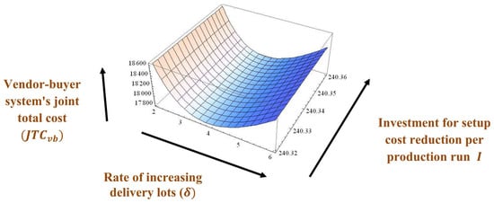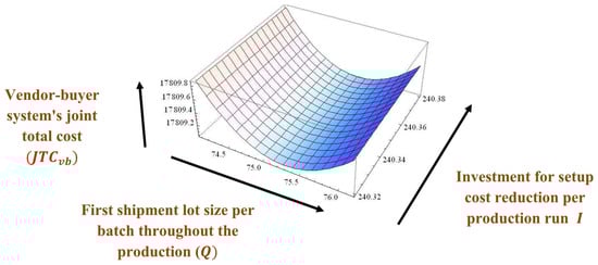 Hence, vendor-buyer system’s joint total cost , first shipment lot size per batch throughout the production units, rate of increasing delivery lots unit/year, and number of delivery lots of each batch per production , and investment for setup cost reduction per production run /production run.