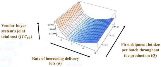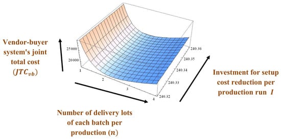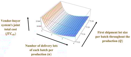 The optimal values , , , and for minimize vendor-buyer system’s joint total cost must fulfil the conditions that all principal minors of Hessian matrix are positive. As the expressions of second order partial derivatives of are non-linear (see Appendix B), thus each principal minors of the Hessian matrix are extremely non-linear. Hence, those conditions to minimize vendor-buyer system’s joint total cost are determined by considering some numerical examples and graphical representations.