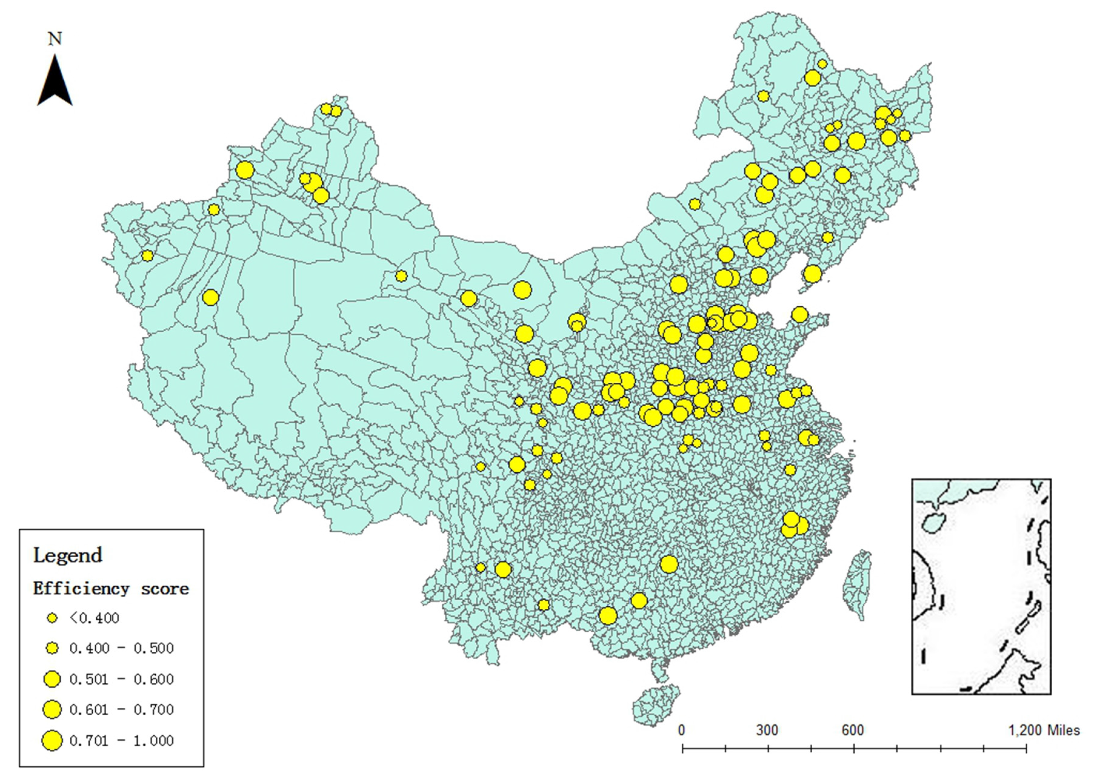 According to Zheng [46], the results under the variable return to scale (VRS) are more reliable. Therefore, the environmental efficiency of grape production in 119 main open-field grape production counties of China was calculated based on the VRS.
