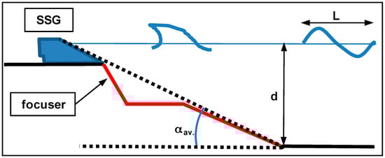 - The (mean) slope parameter [21], i.e., the ratio between the length of the waves at the toe of the focuser (L at the depth d, Figure 2) and the mean horizontal distance between the toe of the foreshore and the shoreline (d/tanαav.):
