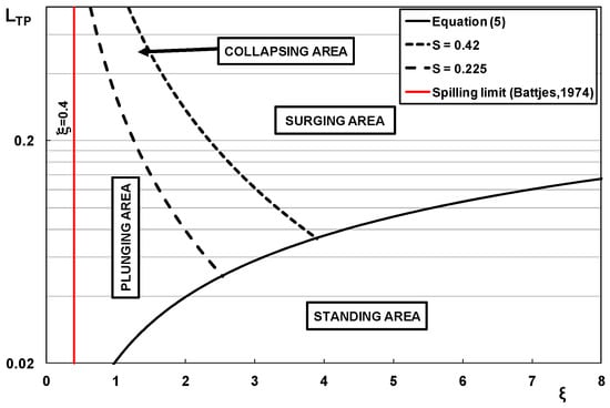 The plane ξ and LTP, modified with permission from Buccino et al. [15]. The graph includes the limit for spilling breakers (ξ = 0.4), as suggested by Battjes (1974).