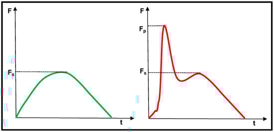 As far as wave forces are concerned, the classification introduced for vertical breakwaters within the EU funded project PROVERBS has been adopted [25]. Accordingly, a force chronogram is termed “pulsating” if it exhibits a unique smooth peak over a wave period (Figure 4, left panel); a double peak pattern is instead named either “slightly breaking” or “impact” (see also [26,27]), depending on whether the first sharp maximum (Fh,max in Figure 4) is lower or higher than 2.5 times the second “pulsating” peak (Fh,q).