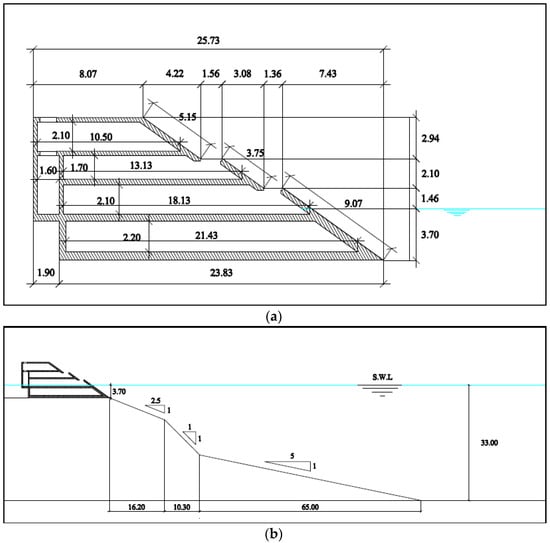 (a) Section of the prototype of the SSG; and (b) the foreshore with the location of the SSG at a full scale. S.W.L. stands for Still Water Level Dimensions in m.