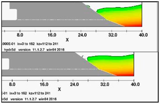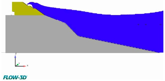 Numerical experiments have been conducted via the suite Flow 3D (Flow Science, Santa Fe, Mexico) [28], which has been proven to be particularly accurate in solving wave–structure interaction problems [29,30]. The software solves the Reynolds Averaged Navier–Stokes Equations (RANS) combined with a Volume of Fluid (VOF) method. For the present application, a Re-Nornalization Group (RNG) k-epsilon turbulence closure has been chosen.