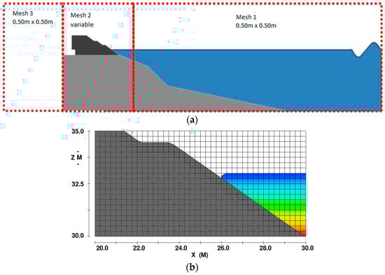 The computational domain (400 m in the X direction and 60 m in the Z direction, Figure 7) is made up on three zones (Figure 8a): meshes 1 and 3 include 62,400 and 14,400 cells of size 50 cm × 50 cm, respectively. The size of the local mesh that surrounds the WEC (mesh 2, Figure 8b), has been instead selected based on an ad hoc sensitivity analysis.