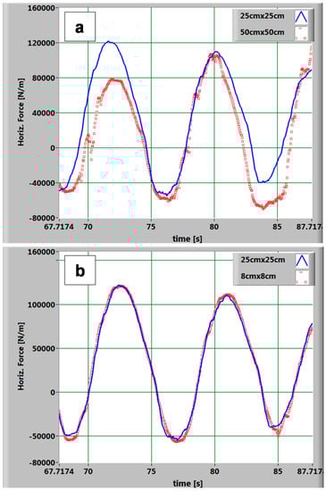 Horizontal force signal at the wall for different grid sizes. (Panel a) 25 cm × 25 cm; (Panel b) 25 cm × 25 cm vs. 8 cm × 8 cm.
