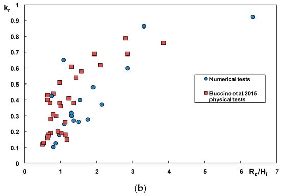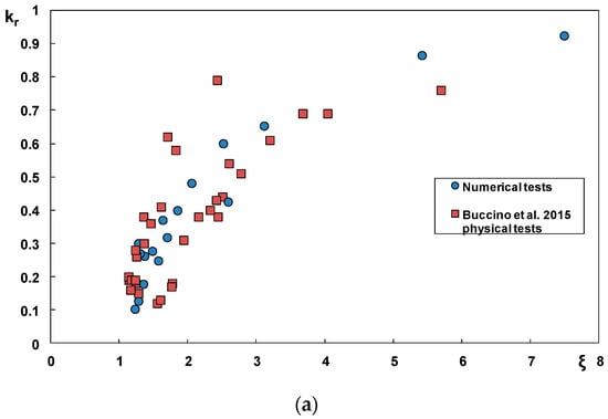 In Figure 11, numerical krs and data of Buccino et al. [15] are plotted vs. the Iribarren number and the relative crest freeboard Rc/Hi. As widely known, the former variable controls the breaking process, whereas the latter is strongly correlated to the average overtopping discharge. The two graphs show that an increase of reflection occurs both when the rate of energy dissipated by breaking decreases (large ξ) and when the amount of overtopping reduces (high values of Rc/Hi).