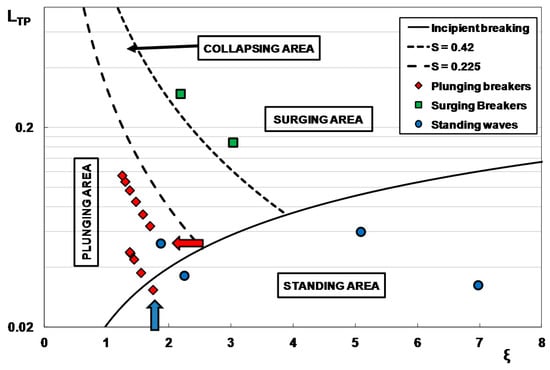 Buccino et al. found out that the wave shapes at the wall could be efficiently distinguished using a chart where ξ is on the abscissas and LTP is on the ordinates (Figure 3); on this plane, all the variables relevant to the breaking process (slope angle, wave steepness, and wave height to depth ratio [24]) are in fact expressly taken into account.