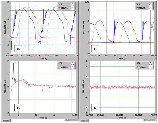 Numerical vs. Physical Pressure chronograms (Test 6). Pressures are expressed in water column. p1: pressure transducer at the toe of the structure; p2 at the still water level; p3 and p4 on the upper plates (see Figure 10).