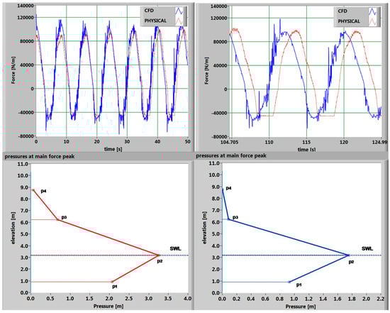 Upper panels: numerical vs. physical chronograms of horizontal force (Test 6). Lower panels: distribution of pressures at the instant of maximum force (the blue solid line is CFD).