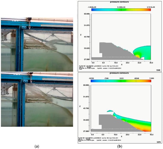 Example of water tongue slamming during the up-rush phase (test C): (a) physical model test; and (b) CFD simulations.