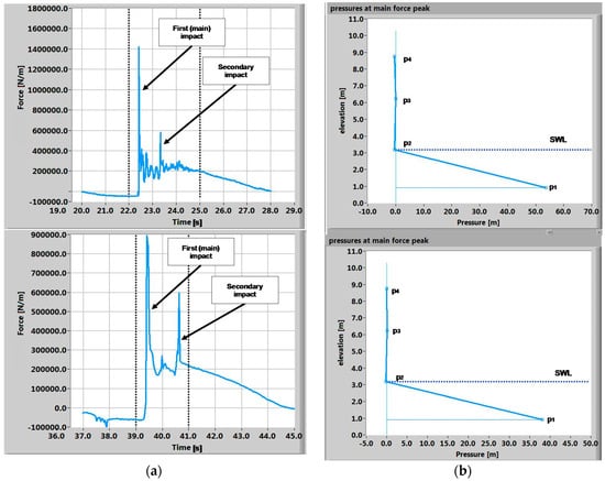 Test 12 refers to a plunging breaker and the observed wave kinematics is generally consistent with that described in several studies conducted on vertical face breakwaters [26,27]. Both in the physical and the CFD experiments, the plunging jet [24,34] is observed to strike the lower part of the WEC (upper panels in Figure 16), with the mass of water that splashes-up and hits again the wall onto the higher plate (lower panels in Figure 16). These two impacts are clearly visible in the time history of the horizontal force (Figure 17a); it is also noteworthy that at the main peak (maximum force), the distribution of pressures results triangular with the maximum in p1 (Figure 17b).