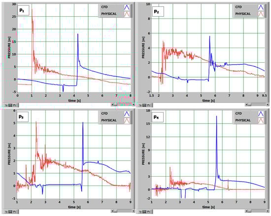 Although shape and magnitude of pressure signals appear consistent on average, CFD is observed to generate low impulse spikes and a slightly lower level of run-down (trough of the pressure waves in the panel p1). It is also of interest that the pressure at the transducer p4 is zero both in the numerical and the physical test.