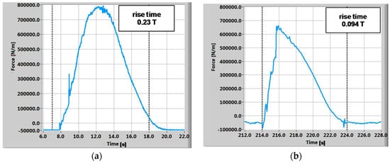 Test 17 is a large surging breaker; Buccino et al. [15] argued that under such condition, pulsating-type chronograms alternate with slightly breaking time-histories. The latter are generated by a water jet detaching from the wave profile during the up-rush phase. These features have been qualitatively observed in the CFD experiment also, but pulsating events appear less “linear”, with a rise-time significantly shorter (Figure 19a,b). Moreover, impact time-histories have been detected instead of the slightly breaking ones (Figure 20a,b); this is likely due to the fact that in the physical experiment, a large area of spray forms during the up-rush, which dampens the slam of the water tongue onto the upper plates of the WEC.