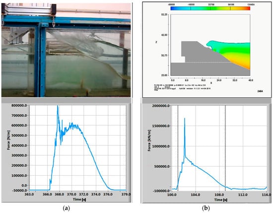 Pulsating loading case for test C: (a) physical model test; and (b) CFD simulation.