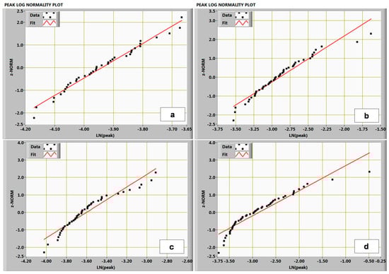 Log-Normal plots of the force peaks for CFD simulations: (a) Test 6; (b) Test 12; (c) Test 7; and (d) Test 17.