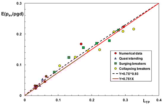 As a further point of interest, it is noteworthy that for non-impact loadings, the gathering of numerical and physical points would seem to support the hypothesis (already formulated in Buccino et al. [15]) that the relationship between the average pressure and LTP may actually be weakly nonlinear. The following slight correction to the Equation (6) can be then proposed (Figure 21, broken line):
