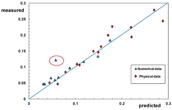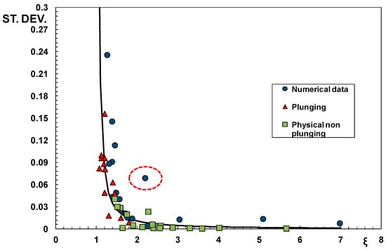However, as shown in Figure 26, when physical and numerical data are plotted against the Iribarren number alone, a reasonable accordance is observed, with the exception of a single outlier circled in red in the graph. The trend of points can be represented by the following power type relationship: