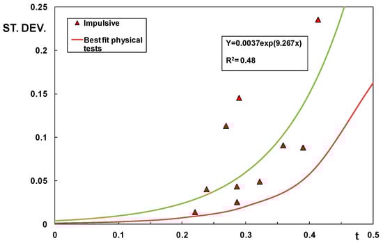 Standard deviation of /ρgd vs. the variable t of Equation (8). Impact waves.