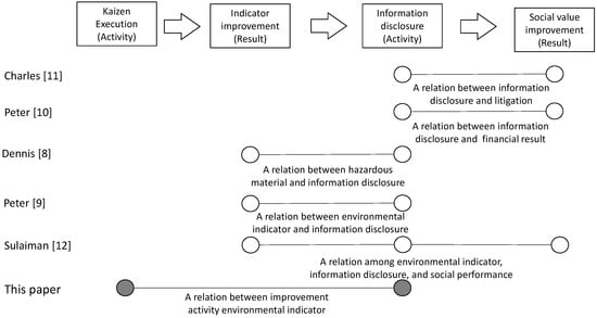 The relationship between indicator improvement and information disclosure is clarified by [,], who analyze the relationships between information disclosure and hazardous material and environmental indicators, respectively. Peter (1998) [] analyzes the relationship between information disclosure and financial results, and Charles (2007) [] analyzes the relationship between information disclosure and litigation. These investigations clarify the relationship between information disclosure and corporate image improvement. Moreover, Sulaiman (2004) [] collects three factors and analyzes their relationship: an environmental indicator, information disclosure, and social performance.