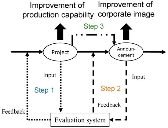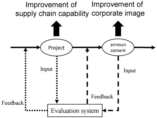Conventional CI, regarded as “Kaizen” in Western literature [], primarily uses performance indicators to effectively manage a supply chain system, such as improving product quality, shortening production and delivery times, and reducing manufacturing costs. Further, the management of these performance indicators strengthens the supply chain’s capability. Figure 2 illustrates the conventional CI evaluation system, a simple feedback loop for reviewing past steps. A CI project’s result, in other words, is input in the evaluation system, and an evaluation result is returned for the next process.
