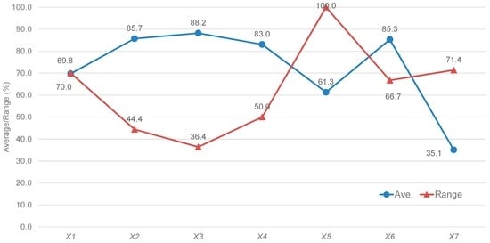 Figure 5 displays each environmental project’s state of implementation. Projects X2, X3, X4, and X6 are advanced in their development, as their average values of Iij are greater than 80.0. The average values of Iij for projects X1 and X5 are less than 70.0. The two projects indicate a slight trend in the average values of Iij, as they are more large-scale and have larger costs than the aforementioned four projects. The average value of Iij for project X7 is less than 40.0, and the average values of Iij for projects X1, X5, and X7 are less than those of projects X2, X3, X4, and X6. However, the range value of Iij for projects X1, X5, and X7 is greater than that of projects X2, X3, X4, and X6. This indicates that a difference in implementation states exists for projects X1, X5, and X7 among the companies in one manufacturing type.
