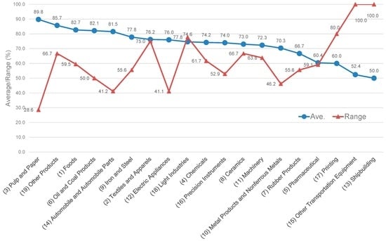 Regarding the projects’ implementation state, Table 3 reveals that the average of values from the 19 manufacturing industry types is 0.98, and the value range for the 19 manufacturing industry types is 0.14. Thirteen manufacturing industry types scored 1.00 for this value. Table 4 notes that in adopting a value to the fourth decimal place, 9 of the 13 types have implemented 1 special program, as follows: