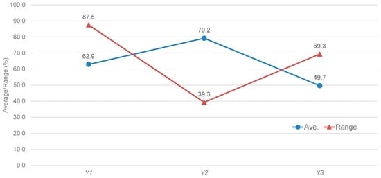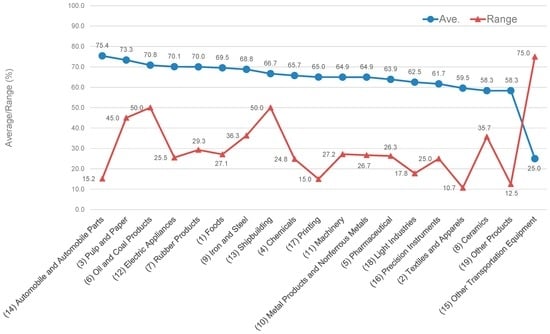 Figure 8 illustrates the state of disclosure for each manufacturing type. The average value of Aik for (14) Automobile and Automobile Parts (75.4) is the highest of all manufacturing types, and the range value of Aik for the industry (15.2) is comparatively low. Namely, companies that belong to this industry positively disclose various indicators. Alternatively, the average value of Aik for (15) Other Transportation Equipment (25.0) is the lowest of all manufacturing types, and the range value of Aik for this type (75.0) is the highest of all manufacturing types. Table 2 reveals that no companies disclose indicators Y1 and Y3 in this type. The average values of Aik for the 13 other industries, except for the aforementioned two industries, are approximately 60.0. Thus, disclosure capability can be improved.