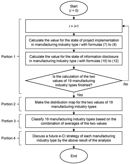 The two proposed models are utilized followed by the flowchart in Figure 9. The procedure consists of four portions; (1) calculating the two values of project implementation and information disclosure in the 19 manufacturing industry types with the two proposed models; (2) visualizing the relationship between the two states of the 19 manufacturing industry types by the distribution map of the calculation results; (3) classifying the 19 manufacturing industry types based on the combination of averages of the two values; and (4) discussing a future e-CI strategy of each manufacturing industry type by the result derived in Portion 3. The result of the analysis is explained in the following section.