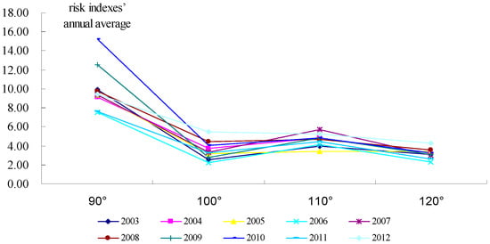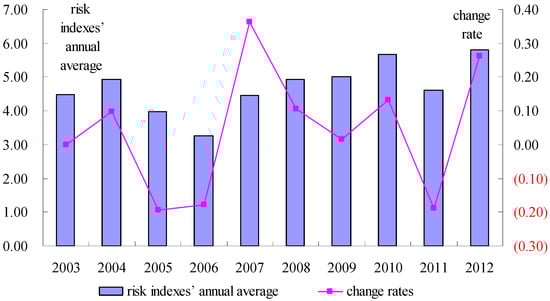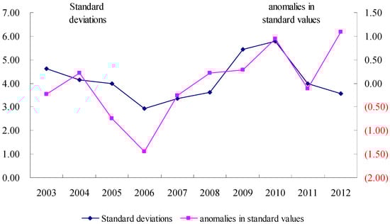 - With regard to temporal characteristics, environmental risks of human settlements in China showed a fluctuating uptrend from 2003 to 2012. The year 2006 marked both a sudden change and a cut-off point when the standard deviations of human settlements reached a trough of 2.94, and the anomalies in standard values also reached a trough of −1.45. After 2006, the uptrend of human settlement risk in China became more obvious, indicating qualitative changes and new risks.