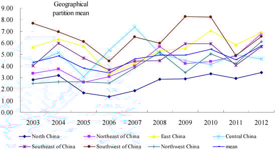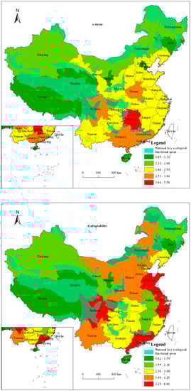 - Adaptability. According to Figure 7, from a perspective of temporal characteristics, the adaptability values were relatively high and were significantly higher than those of vulnerability, functionality, and stress. The overall change of adaptability was relatively stable, presenting a slight decreasing tendency, and its value changes decreased from 3.11 in 2003 to 3.02 in 2012.In terms of spatial patterns (Figure 8d), the overall adaptability of human settlements in eastern China was better than that of central China, which was better than that of western China, except for Sichuan. Guangzhou, Jiangsu, and Zhejiang in eastern China had relatively strong economies, and they invested more in environmental protection and non-pollution treatments of solid waste. Therefore, the adaptability of human settlements in these regions was relatively high. Because the government had carried out ecological environmental management in mining areas in previous years in Shanxi, Shaanxi, and Inner Mongolia, and investment proportions in industrial pollution control projects and environmental protection had increased significantly, the adaptability of human settlements also improved significantly. By initiating projects in Sichuan and Yunnan, like enlarging forest areas and ecological restoration and protection, the adaptability of human settlements has improved consistently.