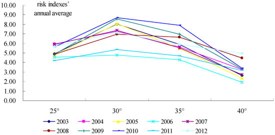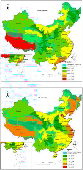 - Vulnerability. The spatial and temporal patterns of the relevant factors of China’s human settlements risk (Figure 7 and Figure 8) show that during 2003–2012, the vulnerability of human settlements was stable and without obvious fluctuation. Its values were between 2.01 and 2.37 with an overall value change range of 0.36.Spatial distribution (Figure 8a) showed that the vulnerability of China’s human settlements was distributed in a scattered fashion but with obvious aggregation in three blocks, namely Tibet and southwestern China, Guangdong and Guangxi region, and Beijing and Tianjin region. According to The National Major Function Oriented Zoning and The National Ecological Function Zoning, the Tibetan area, the forest ecological function region on the edge of the southeastern Tibetan Plateau in southwestern China, Sanjiangyuan Grassland meadow wetland ecological function area, and Ruoergai meadow wetland ecological function area had severe natural geographical environments with complex topographical structures and frequent occurrences of primary disasters. Thus, their human settlements were quite vulnerable. Guangdong, Guangxi, and Hainan areas partially overlapped with ecological function areas for biodiversity at Nanling mountainous forest and the ecological function area at the rainforest in the central mountainous area of Hainan Island. They suffered from frequent occurrences of primary disasters and environmental pollution caused by human activities. Thus, their human settlements were quite vulnerable as well. The meadow ecological function area in the Hulunbeir Grassland of Inner Mongolia, Khorchin meadow ecological function area, and Beilu Grassland meadow ecological function area in Yinshan Mountains were very vulnerable. Human settlements in areas with high population density and exhaust emissions from motor vehicles, like Beijing and Tianjin, also had high vulnerability.