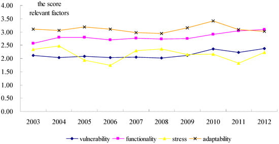 - With regard to relevant factor characteristics, from 2003 to 2012, the temporal change in vulnerability was relatively stable and fluctuation was not very obvious, with values from 2.03 to 2.37 and an overall range of change of 0.34. A slight increase in functionality was observed, with values increasing from 2.58 in 2003 to 3.09 in 2012. However, the overall fluctuation range was not large and the largest change in values was 0.51. The overall fluctuation in stress of human settlements was relatively large; it presented evident stage characteristics and had a near “W”-shaped characteristic, with the largest variation range of 0.73. The adaptability values were higher than those of vulnerability, functionality, and stress. The overall adaptability change was relatively stable although a slight decrease was observed from 3.11 in 2003 to 3.02 in 2012. Spatially, vulnerability was distributed dispersedly but the block aggregation characteristics were evident. There were three blocks: first, Qinghai, Tibet, and southwestern China; second, Guangdong and Guangxi; and third, Beijing and Tianjin. The Beijing and Tianjin region and the Jiangsu and Zhejiang region had the best functionality. Hunan and Sichuan had relatively high stress. Shandong, Jiangsu, Zhejiang, Guangdong, and Sichuan had relatively strong adaptability in human settlements.