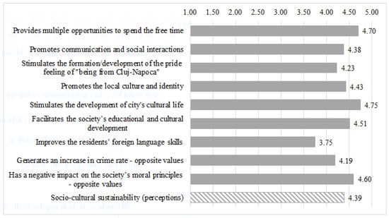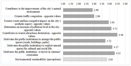 By analyzing participants’ perceptions, it can be observed that there are both positive and negative effects on the environment because of the TIFF in Cluj-Napoca (see Figure 3). What is really important to mention is that the negative effects such as tourist attractions destruction, increase of pollution, or creation of waste are not perceived as a real and lasting threat to the sustainability of the event. The only aspect which could raise concerns is traffic congestion, but, fortunately, this is not such a significant problem; the score obtained is close to the middle of the scale at 2.99. The main open space location is situated in the city center and some of the streets near the location usually are closed in the evenings, potentially causing residents or visitors (who may not know the city well) inconveniences in reaching their destination.