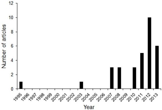 We found 32 articles published between 1995 and 2013 that described the social and ecological factors that affect the adoption of green infrastructure (Figure 1, Table 1). Approximately three-quarters of articles were published in 2010 or later (Figure 1). The objectives of the majority of articles can be grouped into: (1) the development of conceptual or operational frameworks for systemic understanding of green infrastructure use and innovation [,,,,,]; (2) the investigation of factors, such as policy or planning instruments and the action of stewardship groups, that influence the use and performance of green infrastructure and innovation in the field [,,,,,,,,,,]; and (3) the assessment of the performance of green infrastructure in providing ecosystem services [,,,,,,,,,,,,,] (Table 1). Exceptions to this grouping include two articles that described the spatial diffusion of green infrastructure technology [] or defined sustainability and examined its underlying principles []. With the exception of articles that did not examine specific types of green infrastructure (31% of articles), the most common type of green infrastructure focused upon in articles was the green roof (36% of types in articles), followed by greenspace (e.g., greenways) (24% of types) and green building technologies (16% of types) (Table 1).
