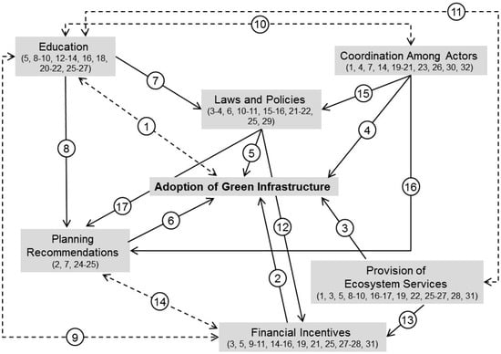 In our hypothesized model of interactions among factors and the adoption of green infrastructure, factors may influence adoption in direct (arrows 1–6 in Figure 2) and indirect (arrows 7–17 in Figure 2) ways. In our model, Education has the greatest number of connections with other factors and adoption (10 incoming and outgoing arrows). First, a feedback relationship exists between Education and adoption (arrow 1). The use of green infrastructure in an area positively influences awareness among the general public, stakeholders, and policy- and decision-makers. This awareness and a deeper knowledge and understanding of green infrastructure may indirectly influence adoption through the creation of Laws and Policies (arrows 7 and 5), Planning Recommendations (arrows 8 and 6), and/or Financial Incentives (arrows 9 and 2). Awareness, knowledge, and understanding of green infrastructure in different groups may facilitate Coordination Among Actors (arrow 10) whereas formal undergraduate and graduate programs function to promote technological innovation in green infrastructure, which positively affects the Provision of Ecosystem Services (arrow 11). Financial Incentives, Coordination Among Actors, and the Provision of Ecosystem Services feedback to Education (arrows 9–11) by means of grants and financial aid to faculty and/or students, knowledge diffusion among groups in a coordinated network, and improved knowledge and understanding resulting from research on and development of the ecosystem services provided by green infrastructure, respectively.
